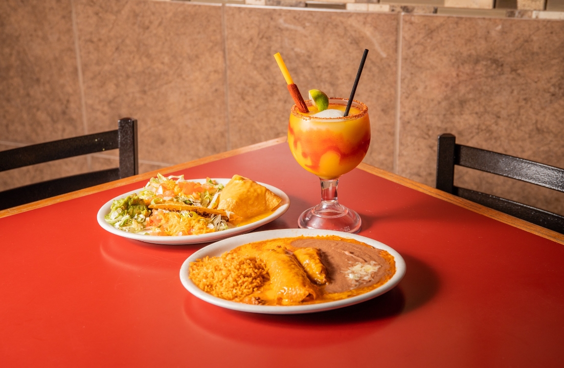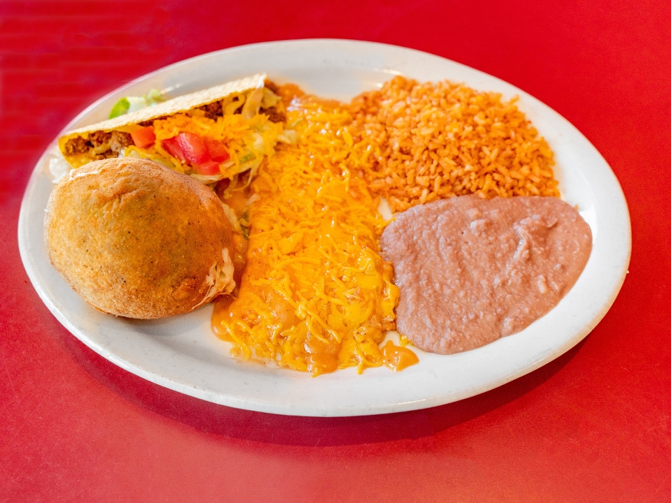 Stuffed with ground beef & topped with ranchero sauce and cheese. Served with refried beans, rice, and flour tortillas