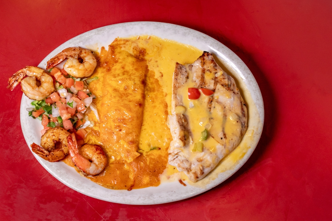 One cheese enchilada, grilled chicken breast, and four grilled shrimp. Served with fresh pico