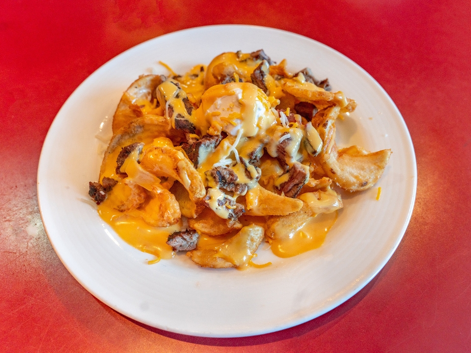 8 oz ground beef steak topped with onions, mushroom, and gravy served with fries
