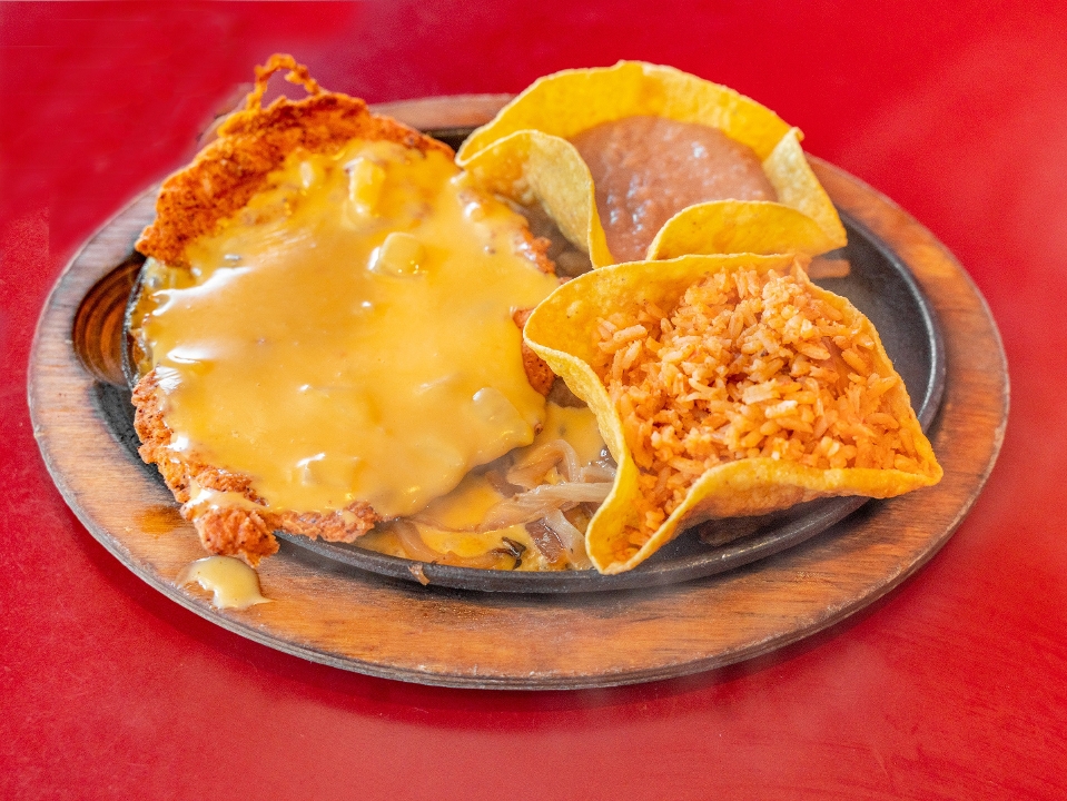 Choice of chicken or beef fajita hand bread and fried and topped with chile con queso. Served with rice and beans.